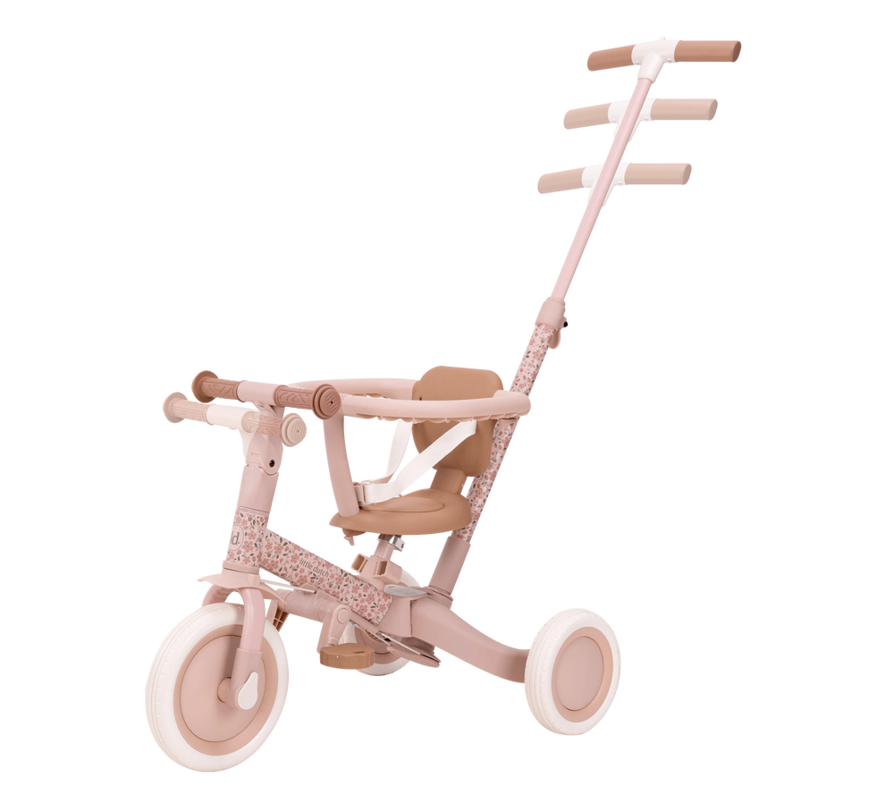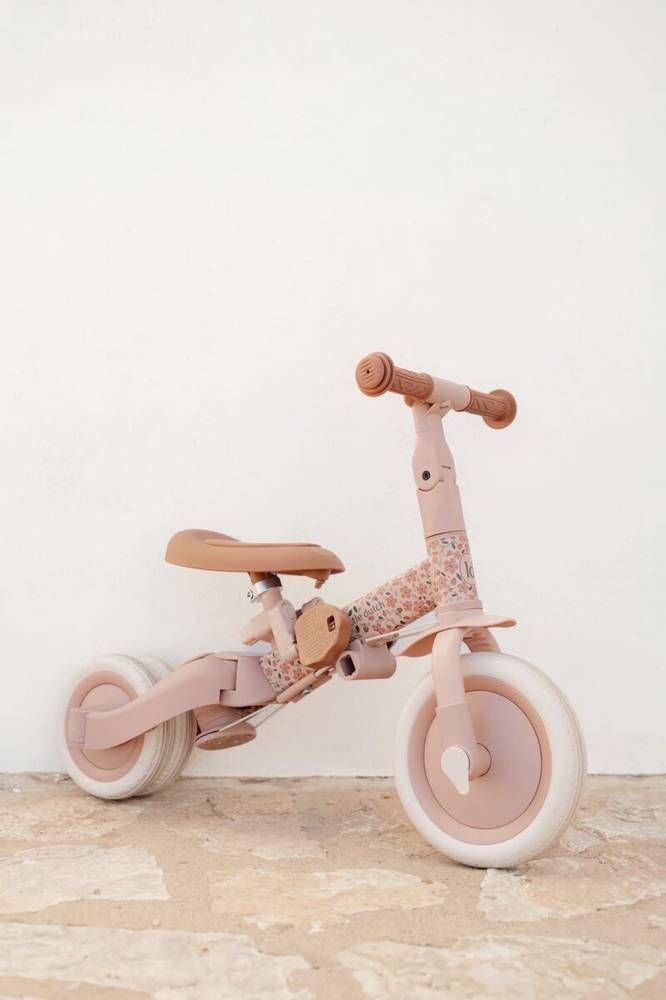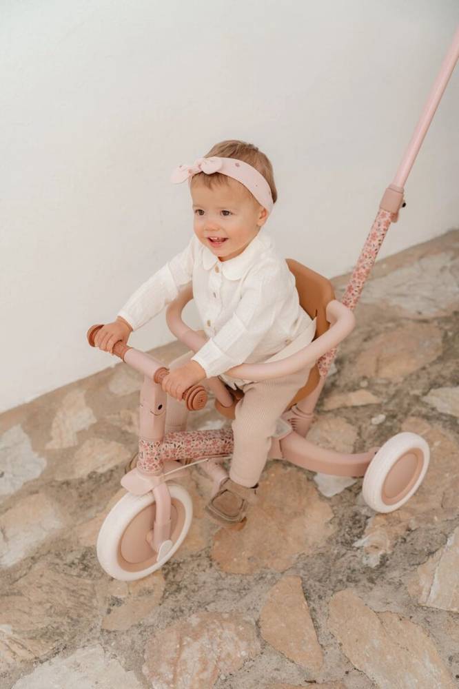 Armsa roosa-lillelise disainiga ja pruunide detailidega mitmeotstarbeline jalgratas sobib ideaalselt lapse esimesteks sõidukatseteks. Tänu mitmele kasutusvõimalusele saab ratast hõlpsasti kohandada vastavalt lapse oskustele – alustades vanema juhitavast variandist ning liikudes edasi tasakaalurattani. Selline järkjärguline üleminek aitab arendada tasakaalu, koordinatsiooni ja enesekindlust liikumisel.