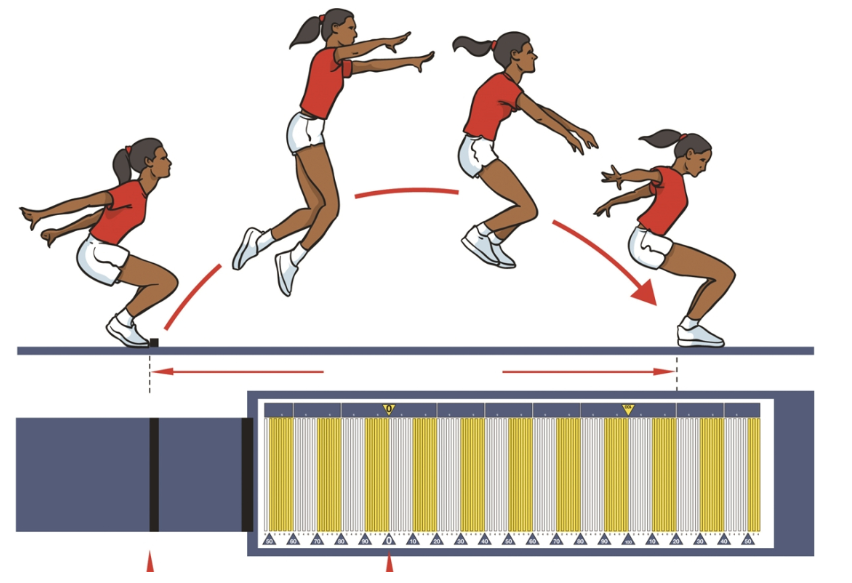 Komplektis on 100 × 50 cm äratõukematt ja 200 × 50 cm gradueeritud maandumismatt. Maksimaalne kaugushüppe mõõtekaugus: 250 cm.