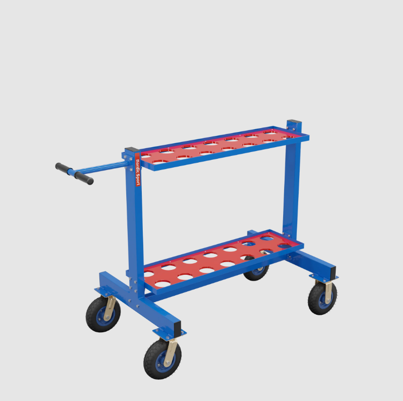 Käru ja alus kuulidele. Pulbervärvitud terasest kuulitõuke kuulide hoidik ratastega. Mõeldud kuni 28 kuuli hoiustamiseks.